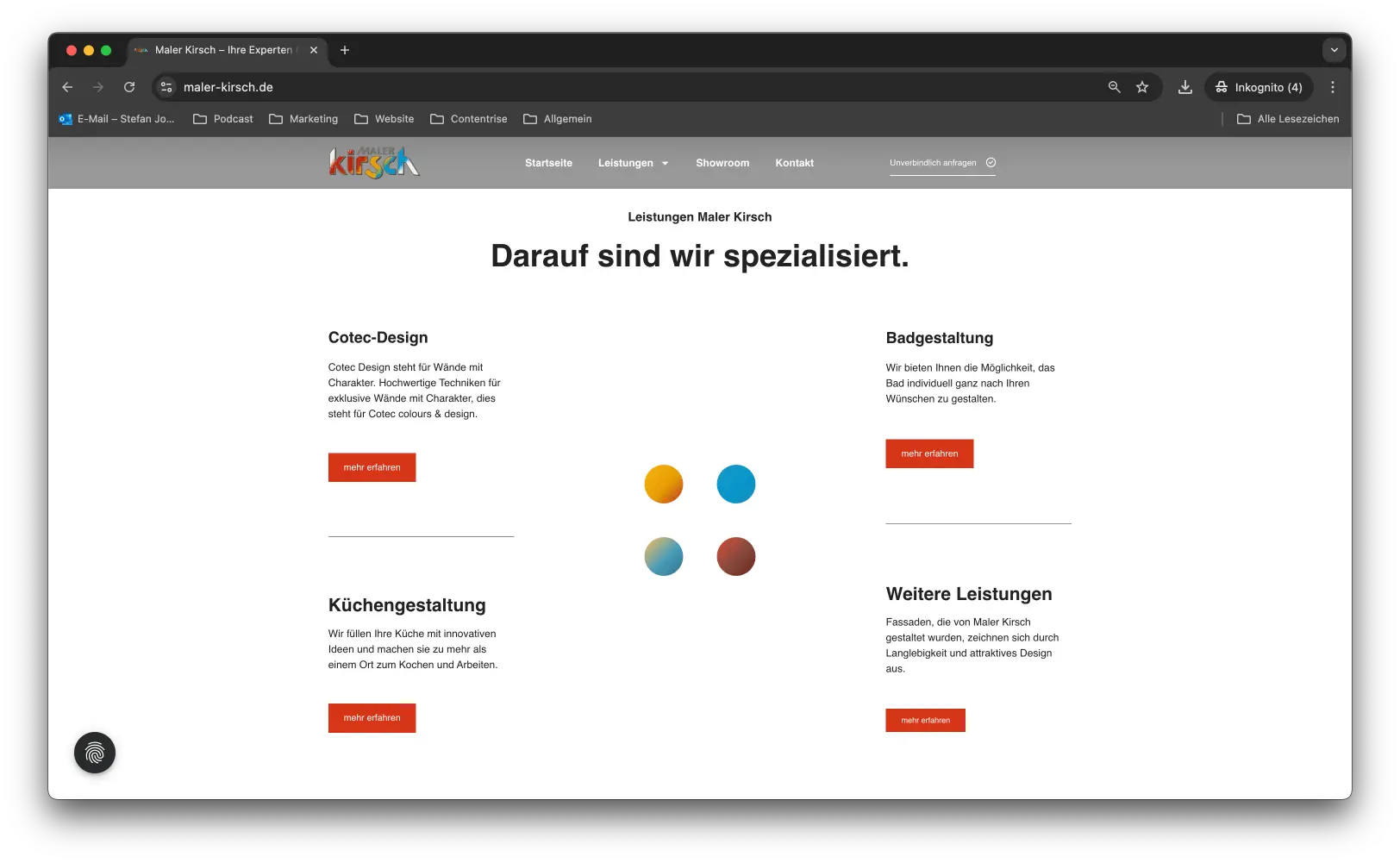 Für den Malerbetrieb Maler Kirsch habe ich eine kompakte Unternehmenswebsite erstellt, die potenziellen Kund:innen schnell einen Eindruck vermittelt – über das Leistungsspektrum, das Team und bereits umgesetzte Projekte.