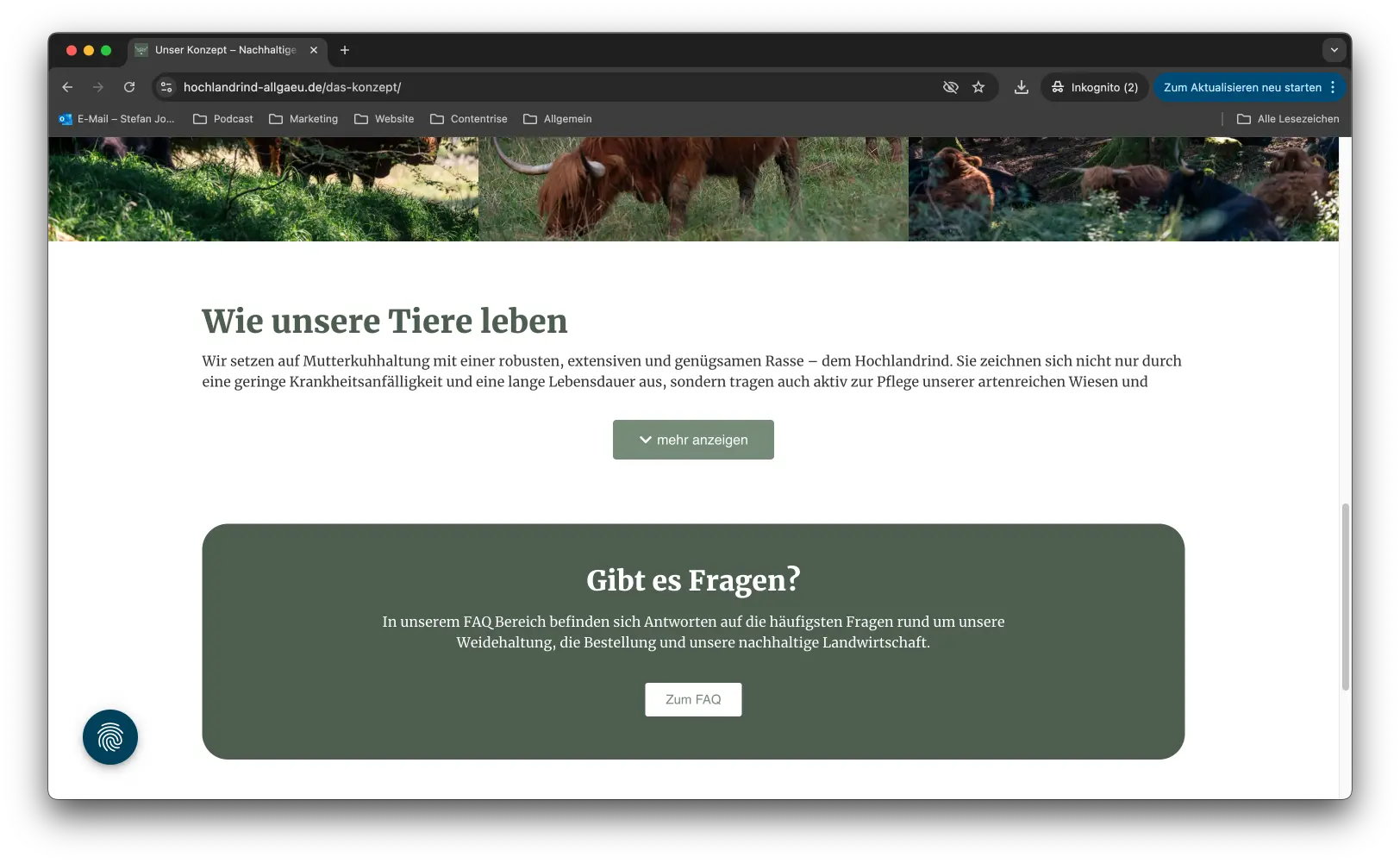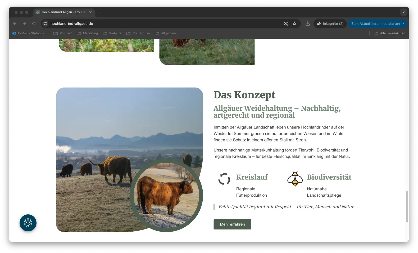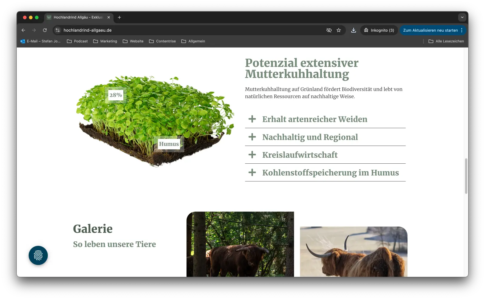 Durch die enge Zusammenarbeit mit dem Kunden konnte ich eine Online-Präsenz schaffen, die die Werte und die Philosophie von Hochlandrind Allgäu authentisch transportiert und gleichzeitig die Sichtbarkeit des Betriebs erhöht.